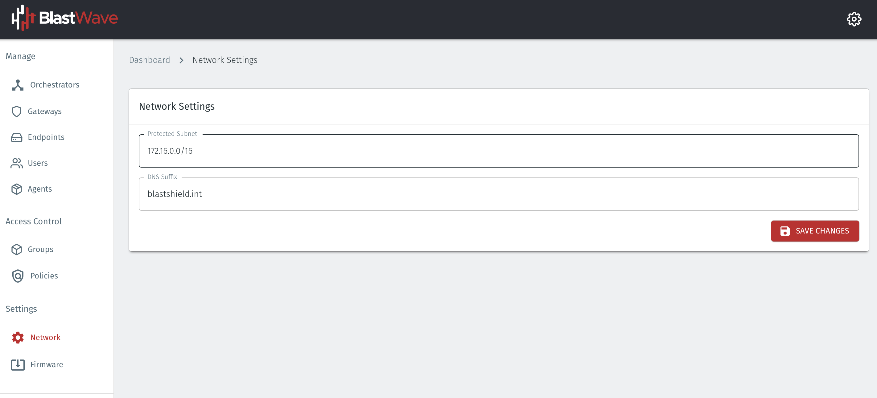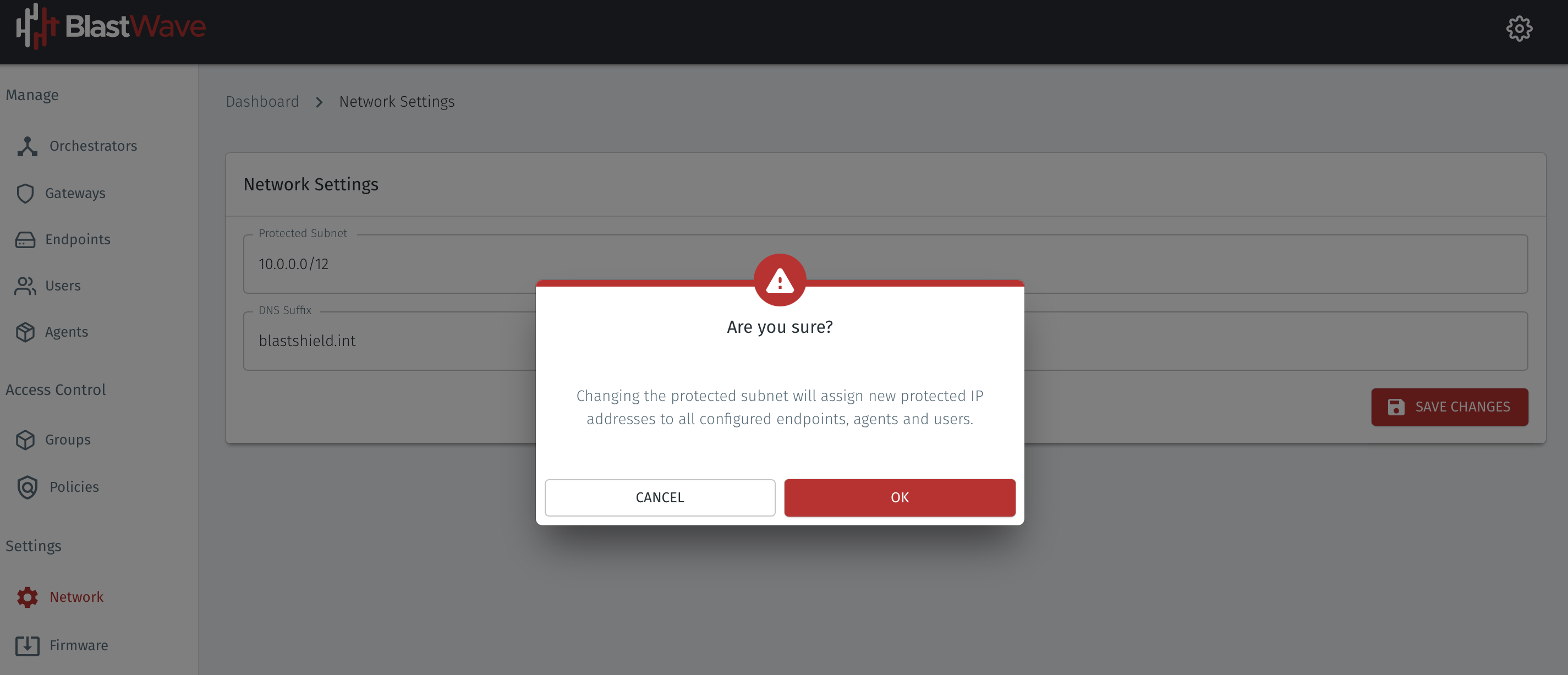 BlastShield assigns IP addresses to all the protected endpoints and authorized users in its secure network. By default, this network is 172.16.0.0/16 and if you want to use a different network prefix, you can change this on the Orchestrator as described in this article. You can use network subnets from /12 to /24. Any endpoints which are already connected, and are using DHCP, will be re-assigned new addresses by the Orchestrator. |