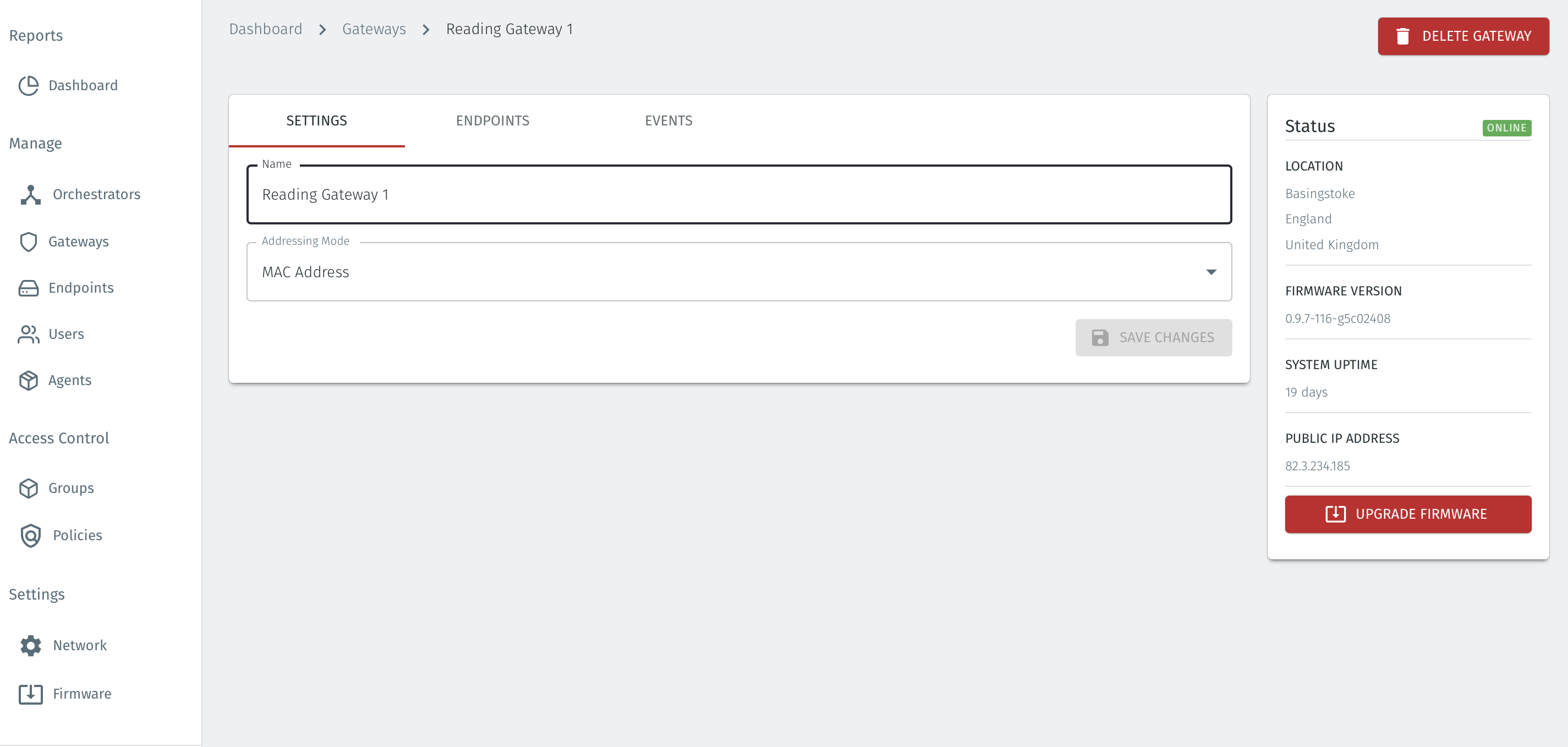Once the upgrade has completed, the Gateway’s status will change to online and the new firmware version will be indicated.