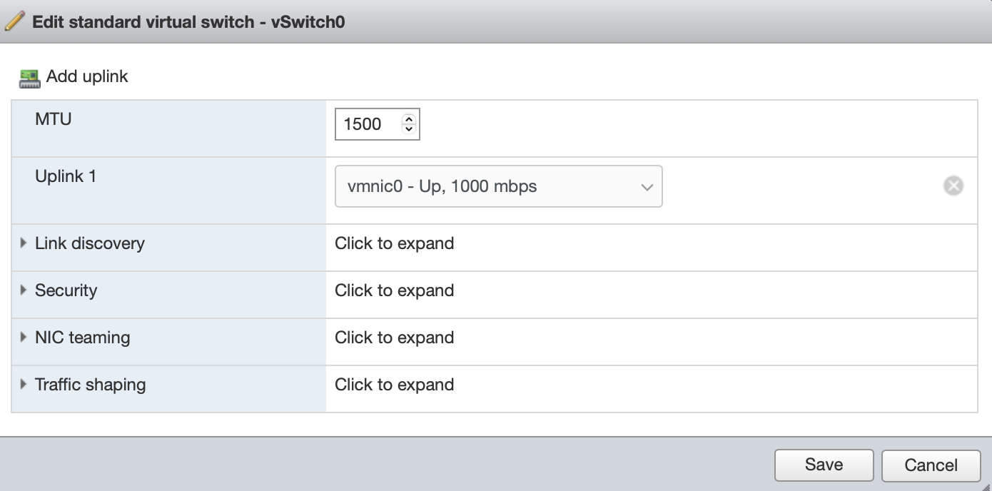 Click on the Add standard virtual switch in the networking tab to add it.. Give it the following settings